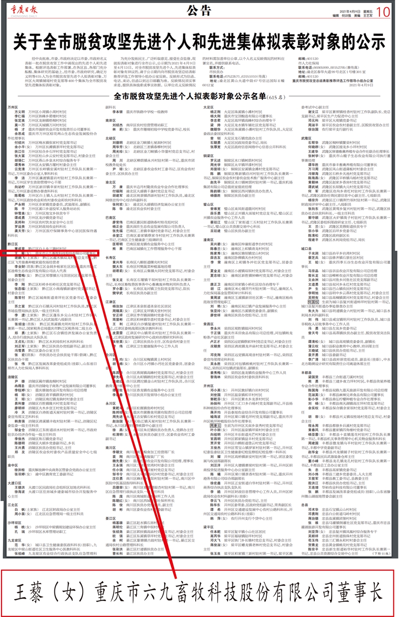重慶市六九畜牧科技股份有限公司董事長王藜女士擬本次市級脫貧攻堅先進個人。