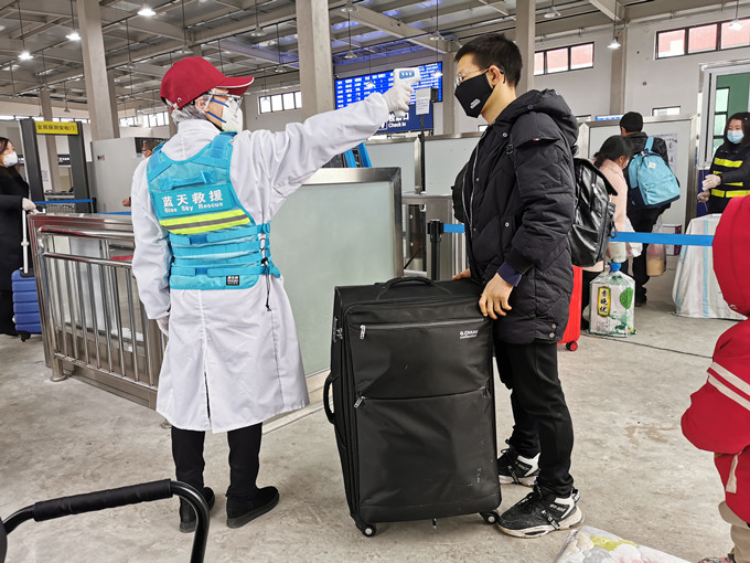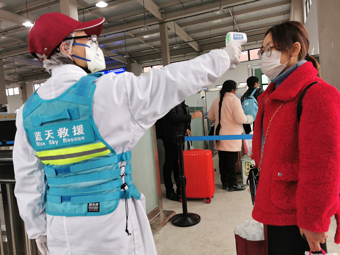 69畜牧董事長王藜女士(圖左1)在黔江火車站為旅客測量體溫