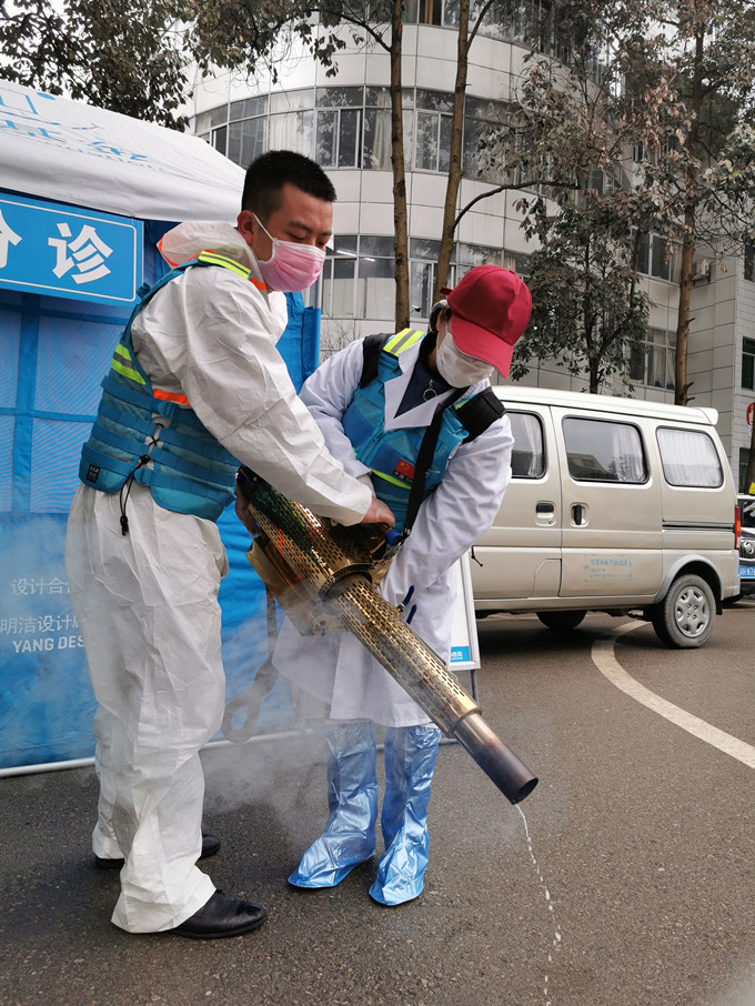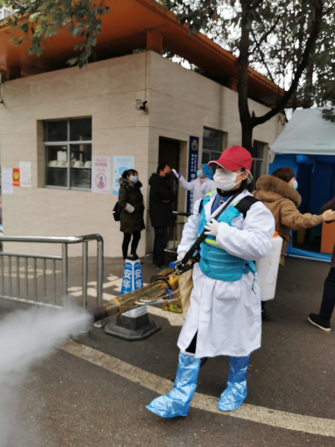 69畜牧董事長王藜女士在黔江區(qū)中心醫(yī)院進行消毒工作